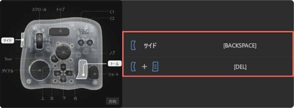 例として図の設定にした場合、「サイド+トール」を押してDELを実行すると、Back Spaceも出力してしまいます。
