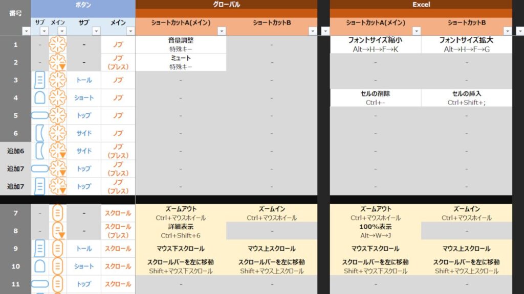 初期の設定や私が作成した設定内容を表にまとめていますので、カスタマイズに活用してください。