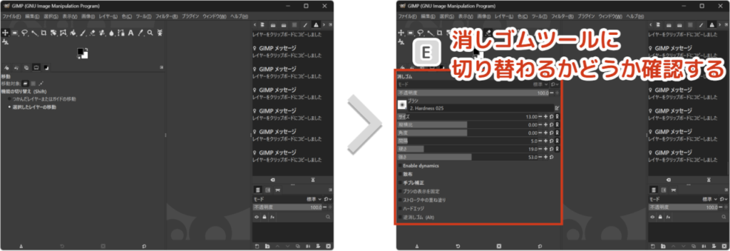 通常消しゴムツールは Shift + E なので、これで動作確認可能です。