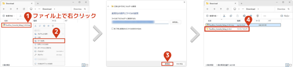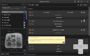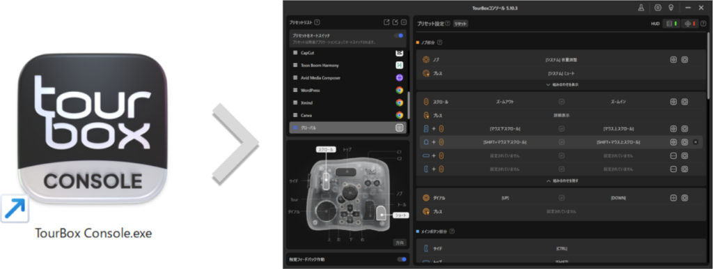 解凍したファイルを実行後、右上のメニューから「TourBox」アプリを起動します。