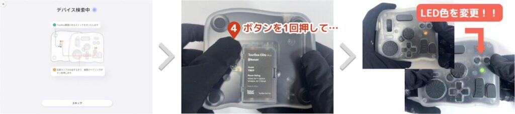 ・橙:PC① / 緑:PC②LED色変更後、裏面のボタンを長押しして、LEDランプを点滅させます。