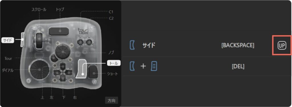 例として図の設定にした場合、「サイド+トール」を押してDELを実行すると、Back Spaceも出力してしまいます。