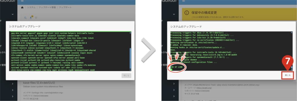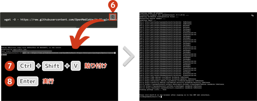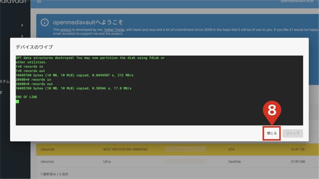 「Press ~ OMV web interface.」と表示がでれば、インストール完了の合図ですので、ターミナルウインドウを閉じてください。