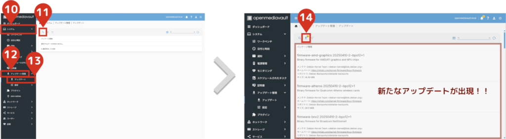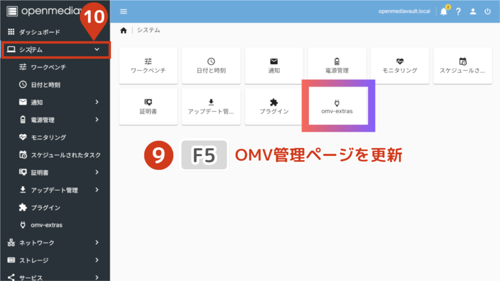 その後、左のメニューから「システム」に移動して「omv-extras」の項目が増えていることを確認してください。