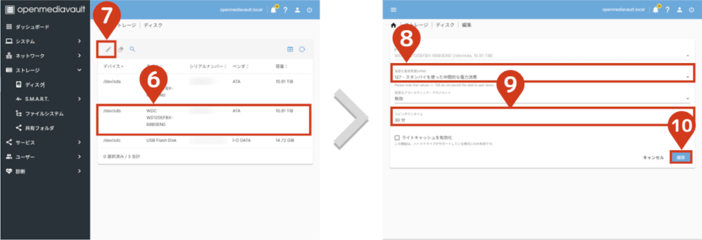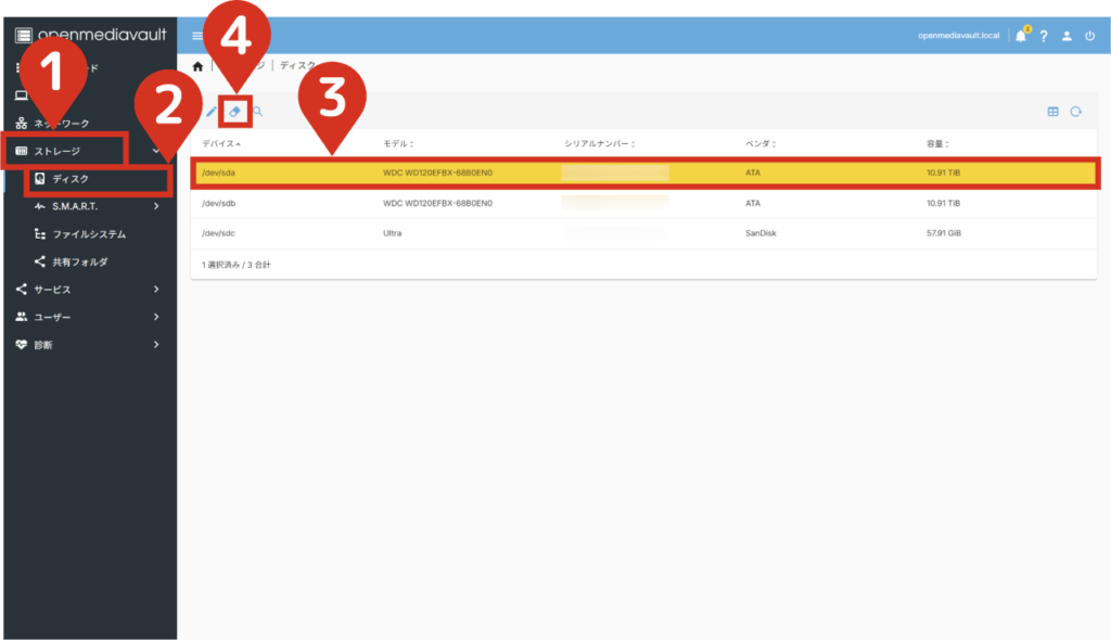 左のメニューから「ストレージ」→「ディスク」に移動して、RAIDを構築しているHDDを選択後、 をクリックします。