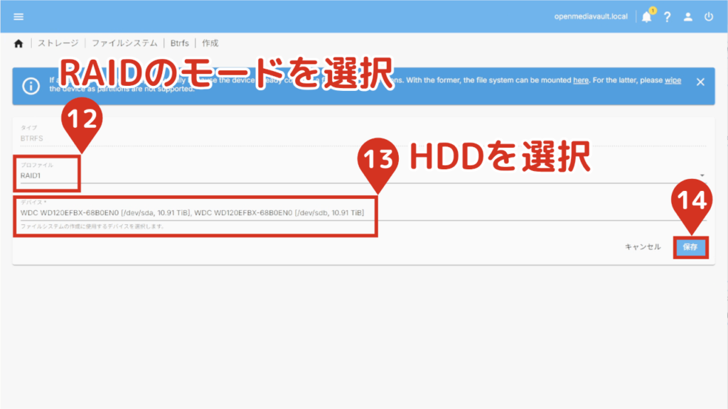 RAIDのモードとRAIDを構築するHDDを選択して、保存してください。