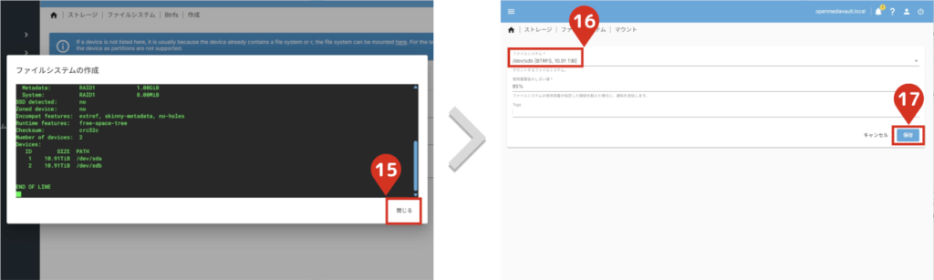 「END OF LINE」が表示後、閉じるをクリックして黒い画面を閉じます。作成されたファイルシステムを選択して、保存をクリックします。