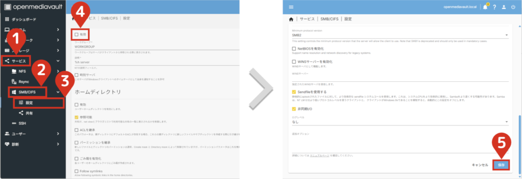 左メニューから「サービス」→「SMB/CIFS」→「設定」にアクセスします。
