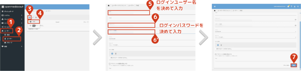 左のメニューから「ユーザー」→「ユーザー」にアクセス後、 をクリックしてユーザーを作成していきます。