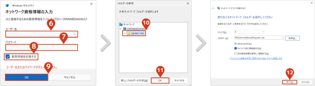 OMVで作成した「共有ユーザー名とパスワード」を入力して、共有フォルダを選択してください。