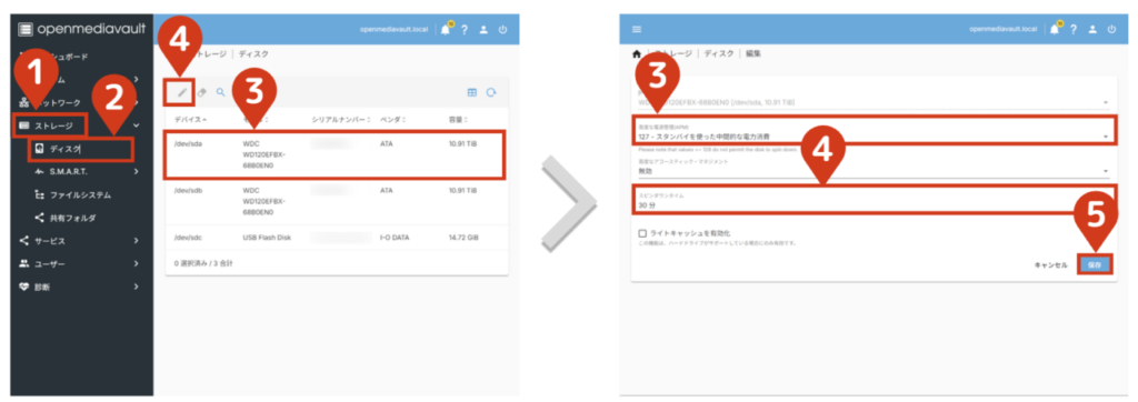 頻繁にNASにアクセスしない方(1日数回)の方は、「APM」とHDDの「スピンダウン」を設定すると、電気代を抑えることができます。