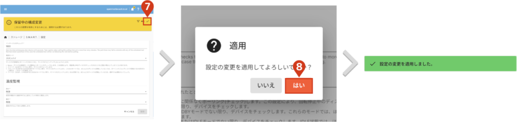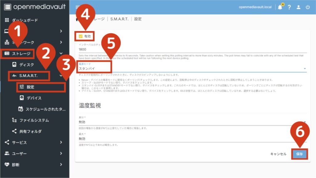 左のメニューから「ストレージ」→「S.M.A.R.T.」→「設定」にアクセスします。