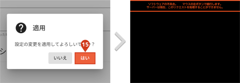 保留中の構成変更のチェックボタンを選択し、適用してください。URLが変更になるので、以下のようなエラー画面になります。