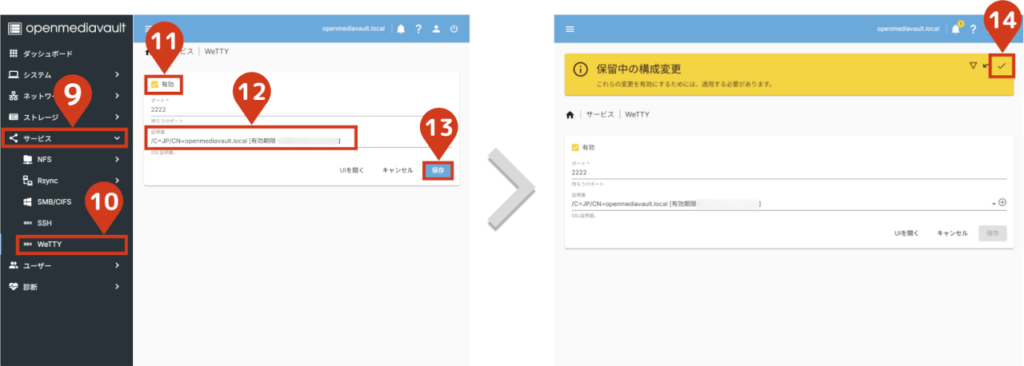 左のメニューから「サービス」→「WeTTY」に移動します。「有効」にチェックをいれて、証明書を選択後に保存をクリックします。