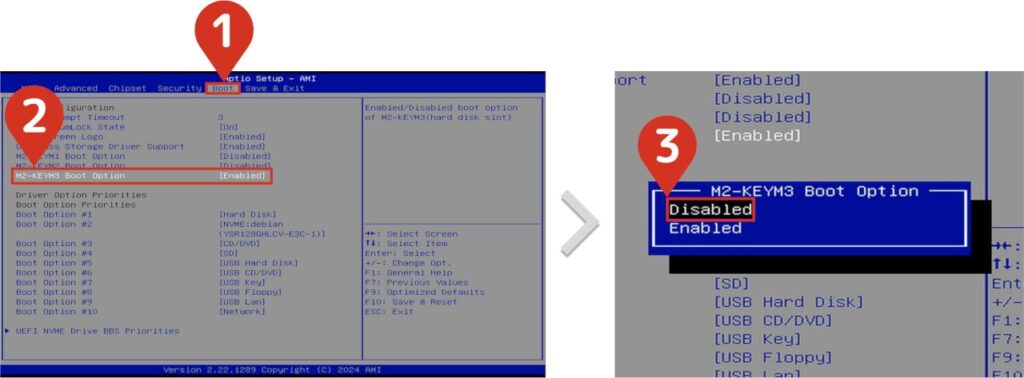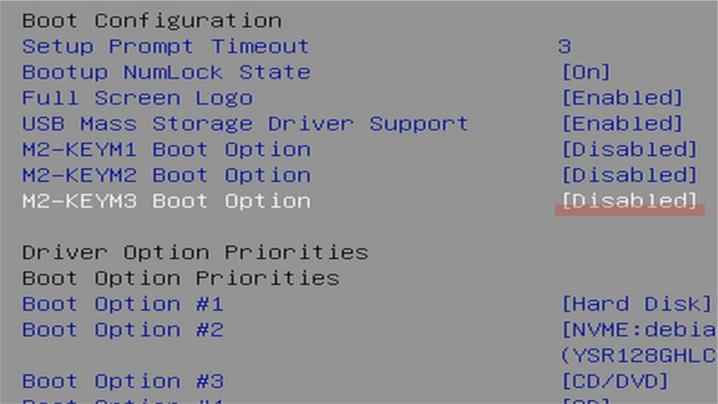 「Boot」→「M2-KEYM3 Boot Option」に移動してEnterを押します。