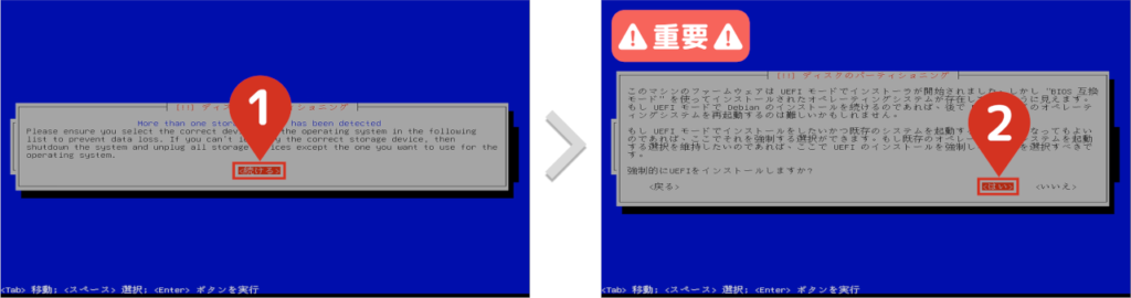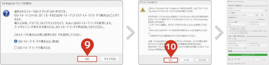 ⑩の警告ははいを選択して、対応するGrubインストールファイルをダウンロードしてください。