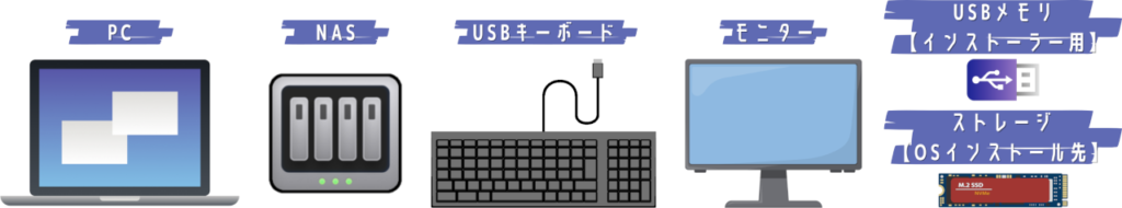 本記事では簡易的にNASを構築しているので、OSのインストール先ストレージは「USBメモリー」で代用しています。
