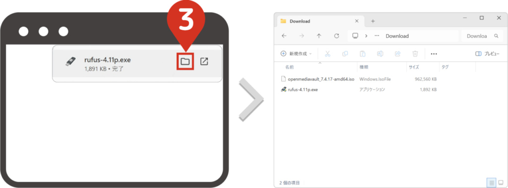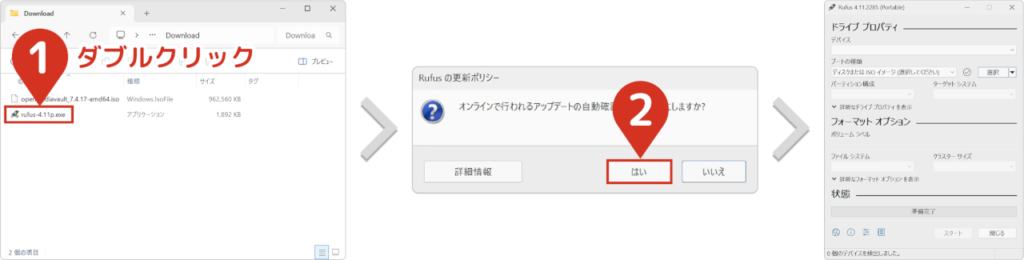 先程ダウンロードした「Rufus」をダブルクリックして、ソフトを起動します。