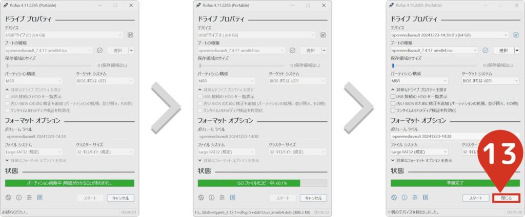 書き込み完了後は「準備完了」と表示されるので、閉じるを押してソフトを終了してください。