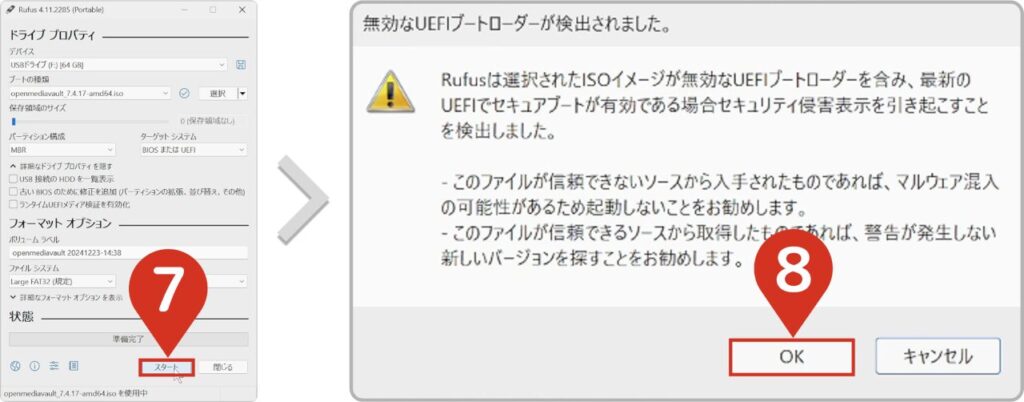 他のオプションはさわらずに、そのままスタートを押してください。警告が表示されますが、無視して進んでください。