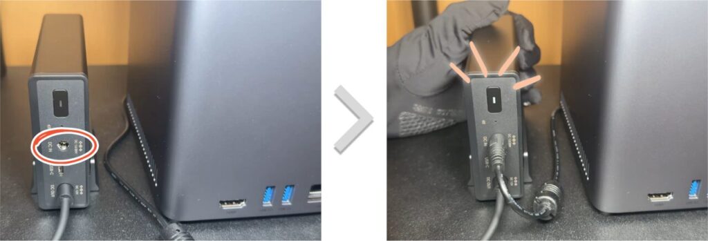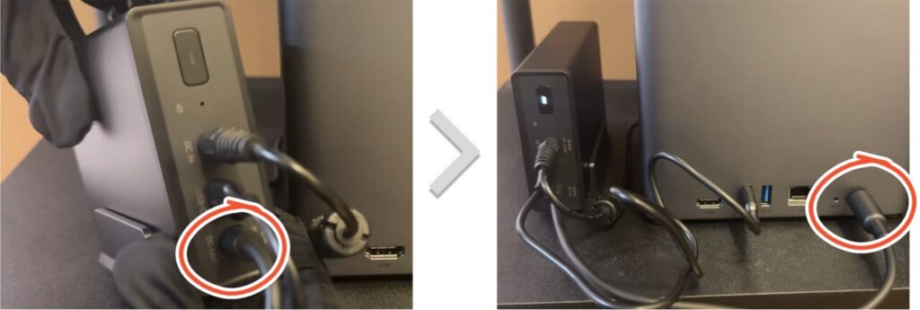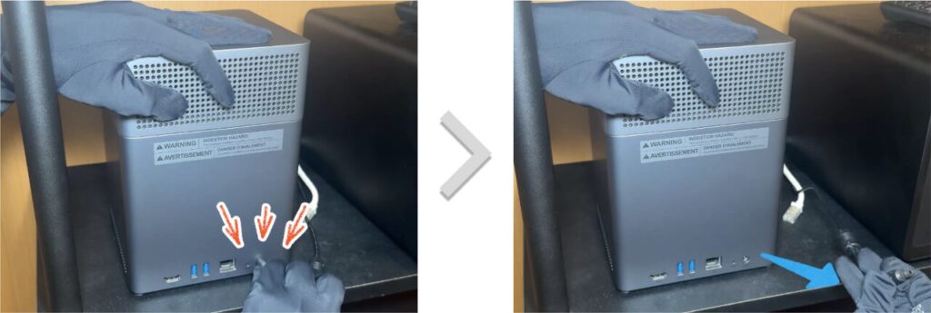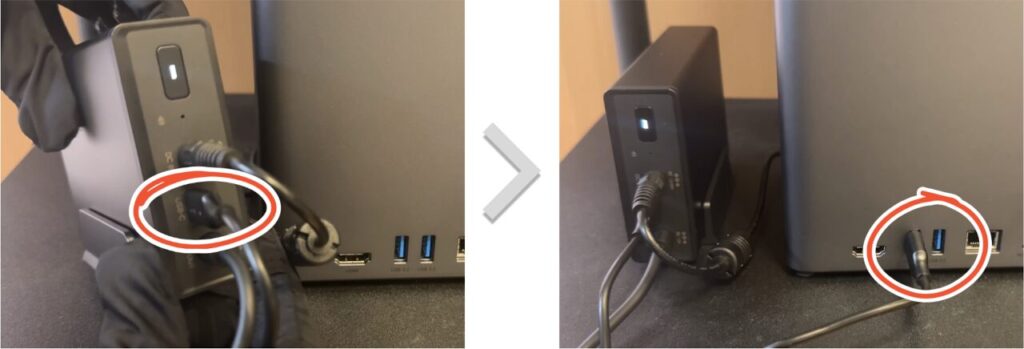 - 5UPSに固定されている電源ケーブルをNASに差し込む