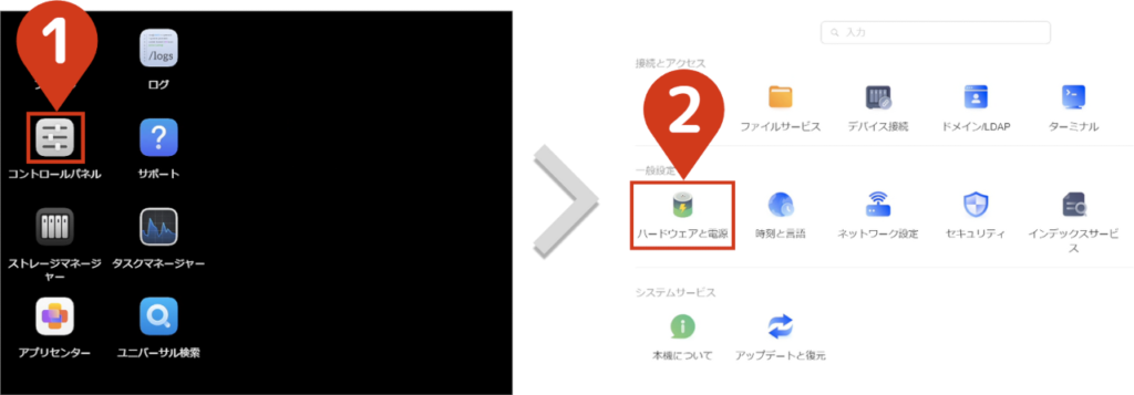 「コントロールパネル」→「ハードウェアと電源」に移動します。
