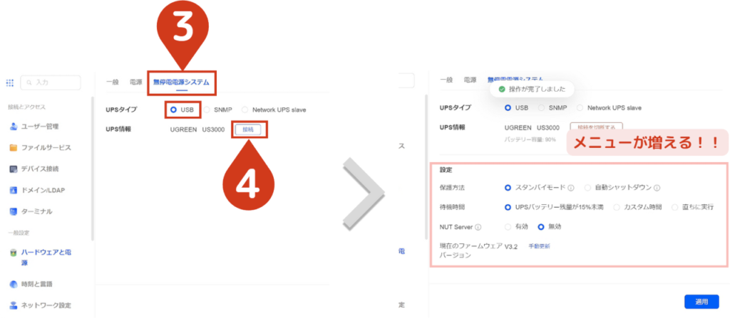 「無停電電源システム」をクリックし、UPSタイプが「USB」になっているか確認後、接続を押します。