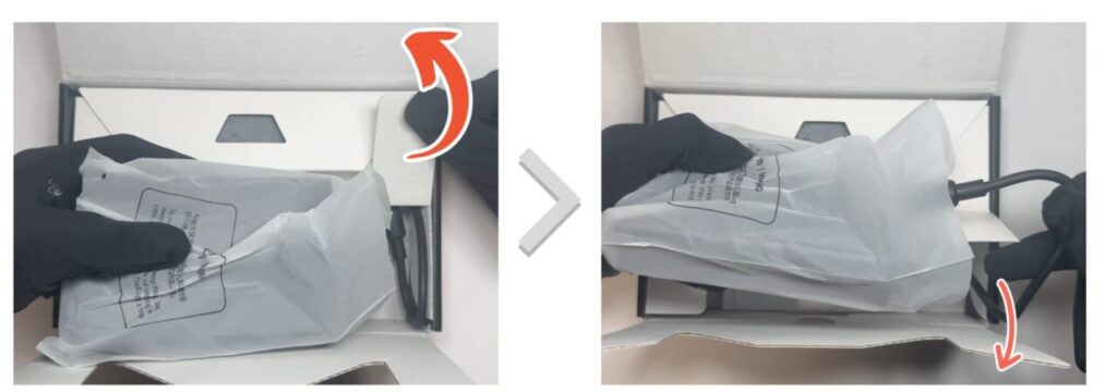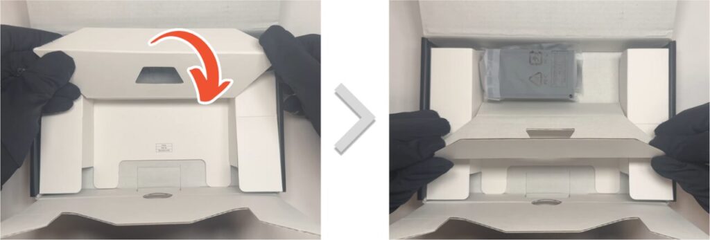 本体だけ引っ張ってもケーブルが箱に引っかかって取れません。先に右側のケーブルを抜き出してから、本体を取り出しましょう。
