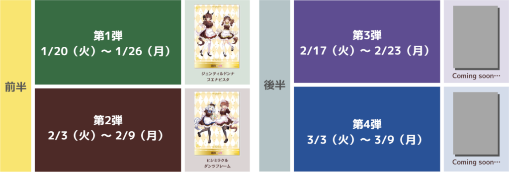 | 開催時期 | 1/20(火)~2/2(月) | 2/3(火)~2/16(月) | 2/17(火)~3/2(月) | 3/3(火)~3/16(月) |