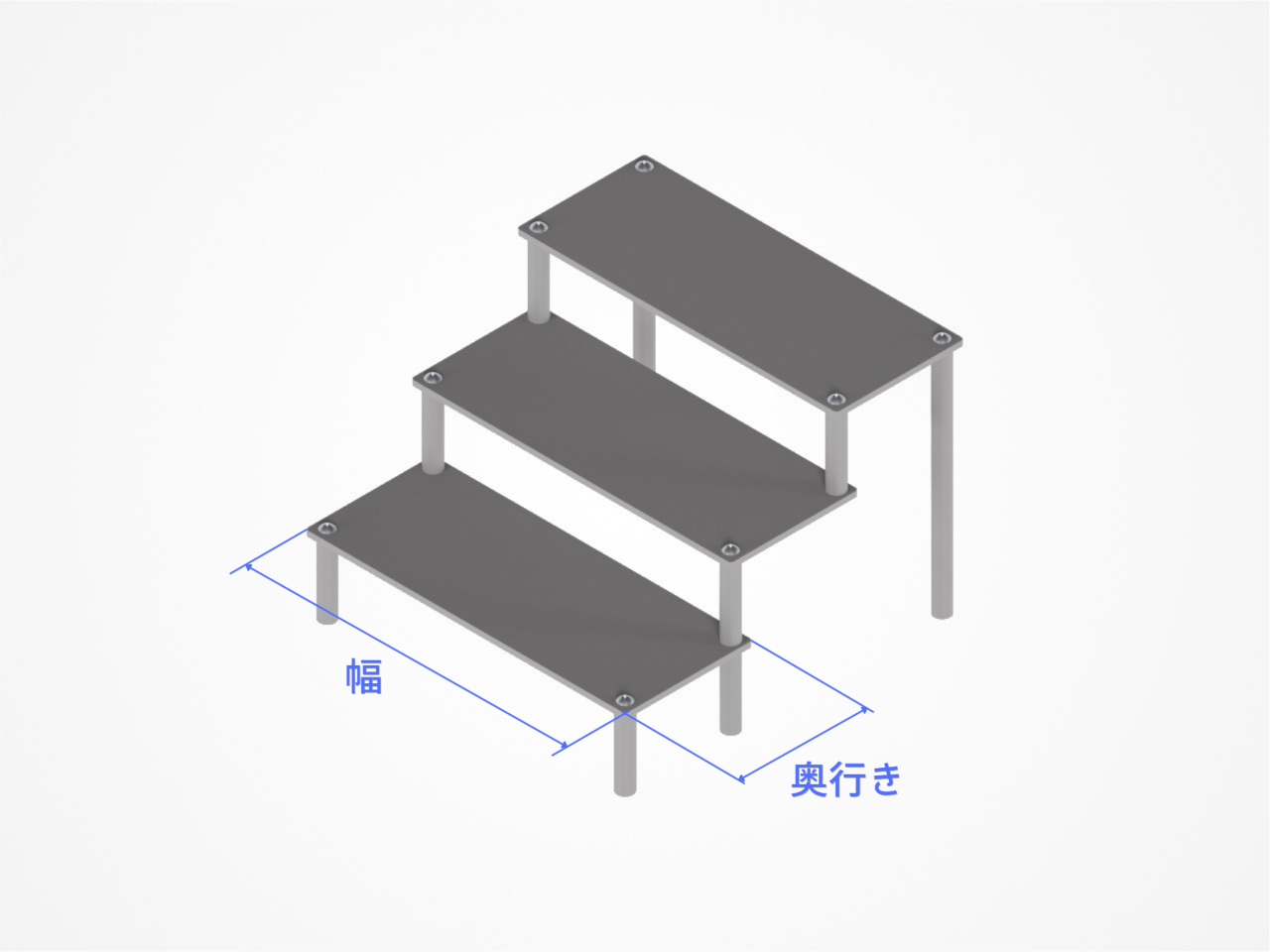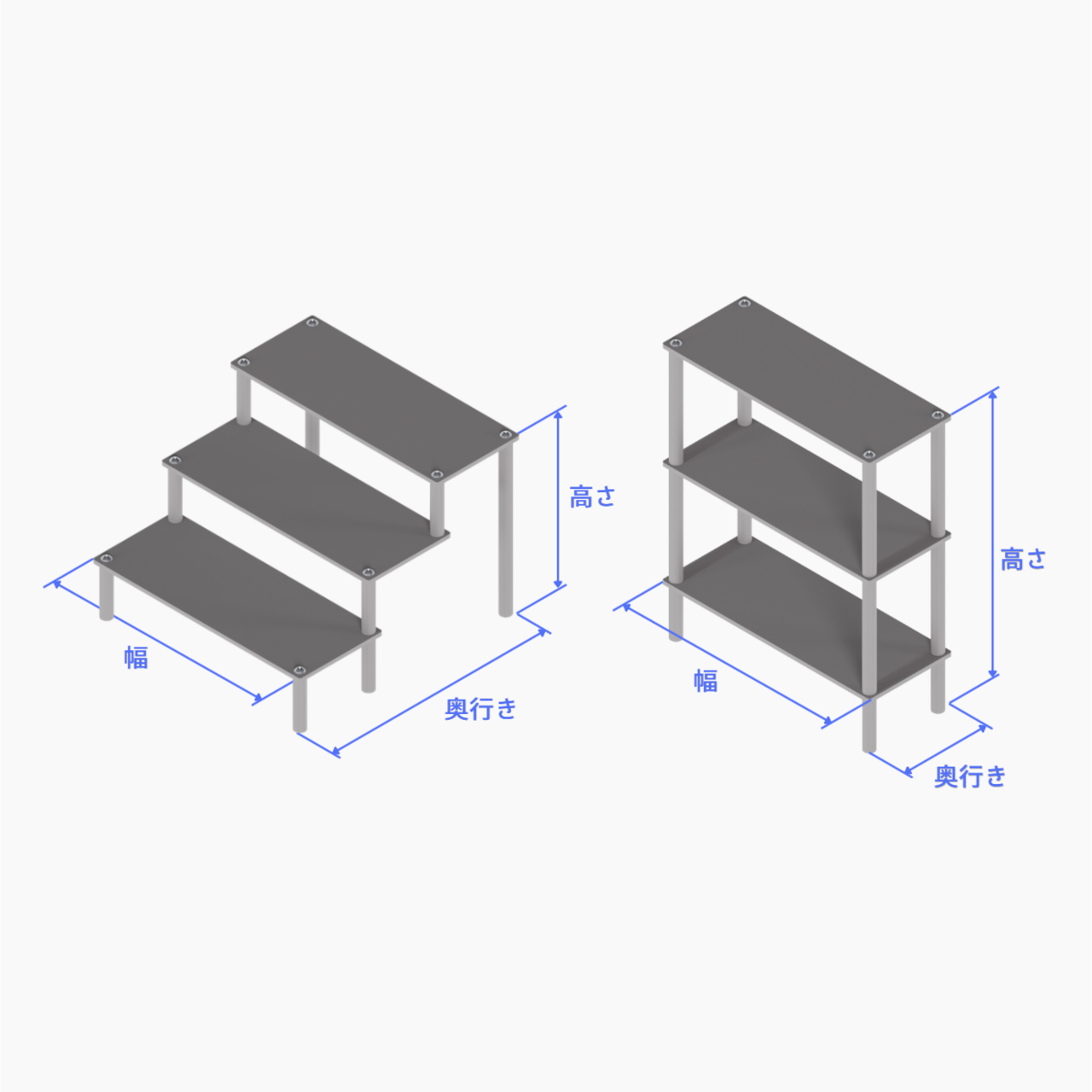 この商品は階段状(ひな壇)やタワー状になっているので、奥にいくほど高さが高くなっているため、奥のモノが隠れる心配がありません。